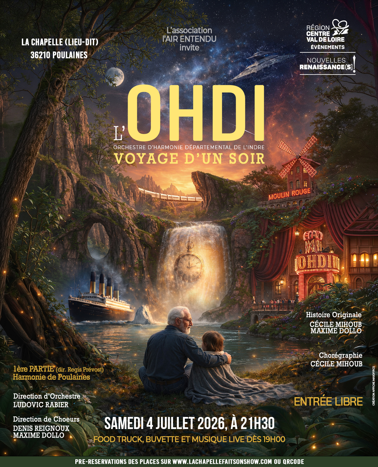Dans le salon de Papy, Izaia et Rosalie écoutent une histoire qui semble ordinaire… jusqu’à ce que la musique ouvre les mondes. De ce récit intime naît une fresque spectaculaire où l’imaginaire prend vie en grand format. Sur scène : 85 musiciens, 100 chanteurs et 60 danseurs, soit 245 artistes réunis pour un événement régional d’ampleur exceptionnelle. Un grand spectacle harmonique en plein air, mêlant narration, puissance orchestrale, chant et énergie chorégraphique.